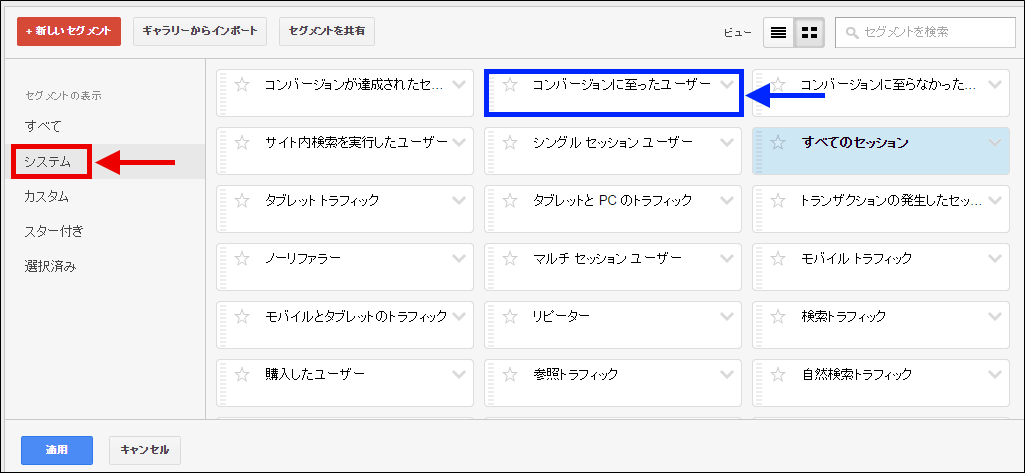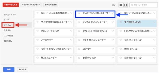 購入者全体セグメントを比較するしたい場合は、「コンバージョンに至ったユーザー」を利用しよう。「コンバージョンに至ったユーザー」は標準に用意されている「システム」分類(図8赤枠部分)のところの2つ目(図8青枠部分)にあるので、これを選択すればよい。