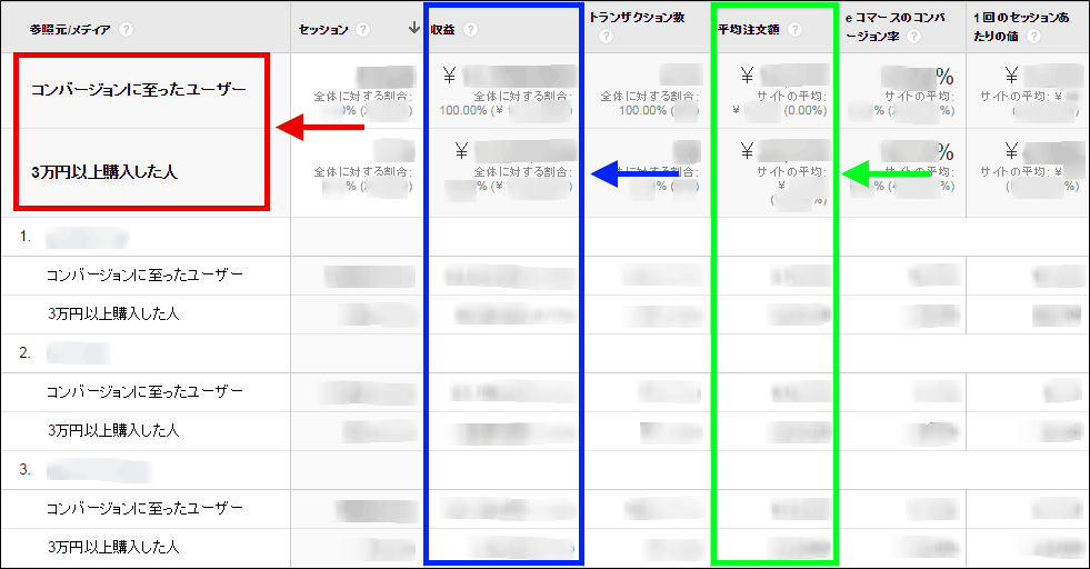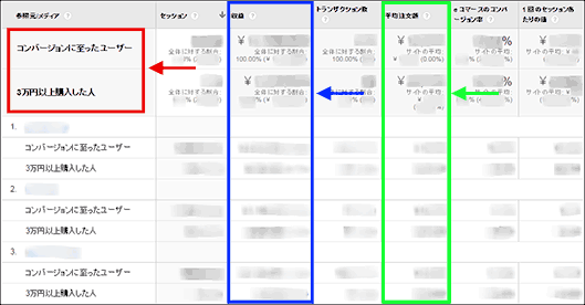 [集客]>[すべてのトラフィック]レポートにセグメントを掛けたのが図9だ。ここでは購入者全体と比較するため、「コンバージョンに至ったユーザー」と「3万円以上購入した人」セグメントを掛けた(図9赤枠部分)。