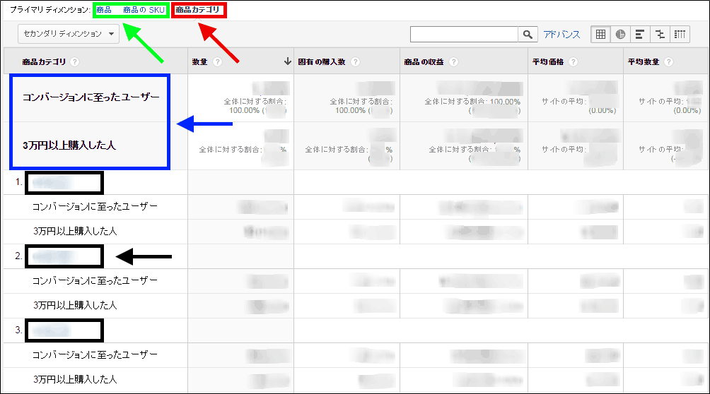 気になった「商品カテゴリ」があったら、該当のカテゴリ(図10黒枠部分)をクリックして「商品」「商品のSKU」レベルにドリルダウンして確認してもいいし、直接「商品」「商品のSKU」のプライマリ ディメンションを選択(図10緑枠部分)してレポートを見てもよいだろう。