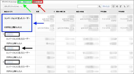 まずは大雑把に捉えるために、商品カテゴリのレベルでどのような違いがあるのかを見るとよい。[コンバージョン]>[e コマース]>[商品の販売状況]レポートで、プライマリ ディメンションで「商品カテゴリ」を選択(図10赤枠部分)する。そして「コンバージョンに至ったユーザー」と「3万円以上購入した人」セグメントを掛けた(図10青枠部分)のが図10だ。