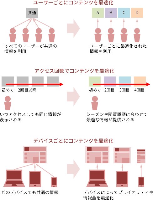 「自社の主力ソリューションに対する4つのニーズにだけ端的に応えるWebサイトから始めてみよう」とか「スマートフォンユーザーには、PCとは違うコンテンツを提供したい」とか……。