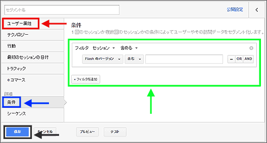 セグメントの条件設定は、図3緑枠部分で行う。今回設定するセグメントは「新規訪問でコンバージョンしたセッション」で、図4のような設定内容にする。