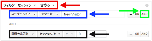 セッション ベースのセグメントなので、フィルタの設定は「セッション」「含める」と指定(図4赤枠部分)し、「新規訪問」にあたる部分の指定としては、「ユーザー タイプ」「完全一致」「New Visitor」(図4青枠部分)とする。その上で、条件の掛け合わせをするために「AND」(図4緑枠部分)をクリックする。続いて「コンバージョン」セッションの指定は、「目標の完了数」「セッションごと」「>」「0」と指定する(図4黒枠部分)。