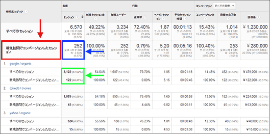 図5の例では、たとえばgoogle / organic(グーグルの自然検索)経由のセッションは全体の47.52%(3,122/6,570)を占めるが、さらに「新規訪問でコンバージョンしたセッション」のセグメントを掛けると、そのセグメントの中での割合は48.41%(122/252)となっている(図5緑枠部分)ということがわかる。