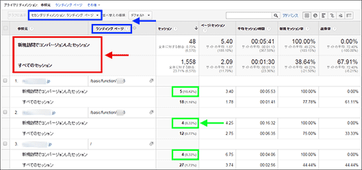 レポートを見やすくするためのポイントは、「新規訪問でコンバージョンしたセッション」のセグメントの方を先に持ってくるということだ。こちらを先にすると、該当セグメントの掛かったデータの方をベースにして並び替えされるので、大きなギャップのあるデータが上方に集まるという効果がある。つまり図6緑枠部分のように、上方を中心に見るだけで済むのだ。