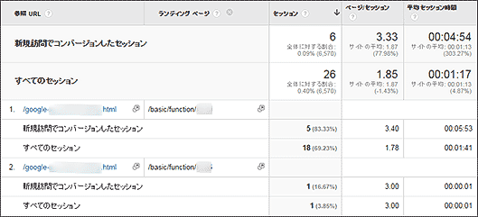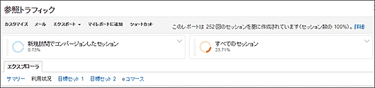 ①のレポートをさらに掘り下げて、「新規訪問でコンバージョンしたセッション」の割合(あるいは量)が多かったドメインの「参照URL」を見てみよう。