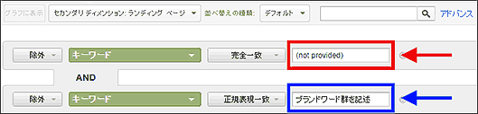 Google検索はほとんどが「(not provided)」になるので、それを除外し(図10赤枠部分)、さらにブランドワード(社名や商品・サービス名に関連するキーワード)は正規表現でこれらも除外する(図10青枠部分)ようなフィルタを記述してほしい。