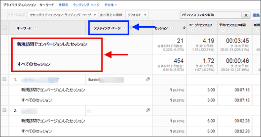 もともとある「すべてのセッション」セグメントは左側にあり(図7赤枠部分)、追加で選択したセグメントは右側に追加(図7青枠部分)されていく。下の図5(再掲)はこの状態で、レポート下部の一覧表示部分を示している。「すべてのセッション」セグメント、「新規訪問でコンバージョンしたセッション」セグメントの順に表示されているのがわかるだろう。