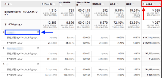 レポートに表示された第1位のページ(図12青枠部分)は、コンバージョン ページそのものであることが多い。コンバージョン ページそのものあるいは、カートなどコンバージョンに必要な手続きのページ群は上位に来るので、そういったページ以外で重要なページが潜んでいないかよく調べてみよう。