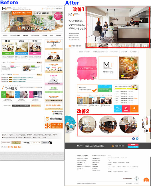 改善2:ペルソナに近い事例を紹介するページへビジュアルリンクを設置しました。たとえば、ホームパーティを楽しむ独身女子、50代で趣味をたのしむ独身貴族男子など、ペルソナにダイレクトにひびくコンテンツです。リノベーション後のオシャレな暮らしや、レイアウトを参考にしてもらうためです。