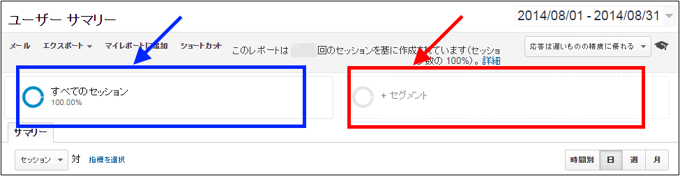 まずレポート画面の上部にある「+セグメント」(図1赤枠部分)のエリアをクリックしよう。ブラウザ表示の横幅が狭い場合は、すべてのセッション(図1青枠部分)の下に並んで表示される。