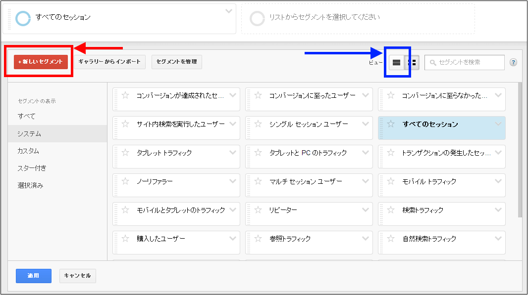 「+セグメント」(図1赤枠部分)のエリアをクリックすると、図2のようなセグメントの機能が表示されるので、左上にある「+新しいセグメント」(図2赤枠部分)をクリックして新規セグメントを作成していこう。