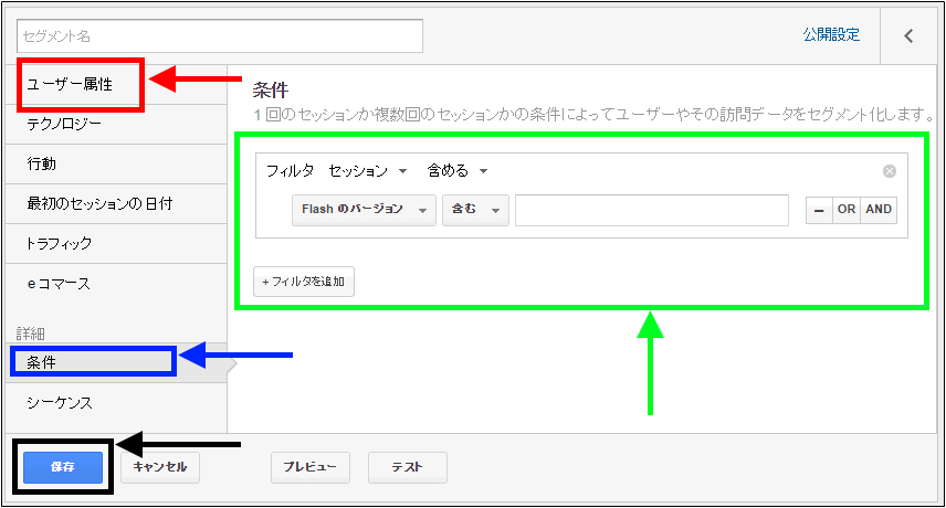 セグメントの条件設定は、図3緑枠部分で行う。今回設定するセグメントは「スマートフォンで閲覧し、直帰したセッション」と「スマートフォンで閲覧し、直帰しなかったセッション」だ。それぞれは図4、図5のような設定内容になる。