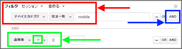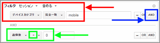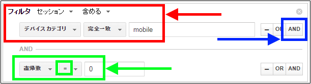 - 直帰数が0(「直帰数」「=」「0」)(図5緑枠部分)※「=」の部分だけが異なるほかは、直帰したセッションの設定と同じ。