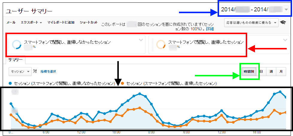 [ユーザー]>[サマリー]レポートに、この2つのセグメントを掛けた(図6赤枠部分)のが図6だ。時間別に傾向を見やすくするため、集計対象は2日程度選択(図6青枠部分)し、グラフの表示単位を「時間別」(図6緑枠部分)にする。
