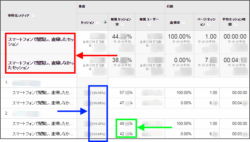 また新規セッションの方が、はじめの印象が悪い、あるいはなじんでないことが多いために直帰率が高めに出ることが多いと思うが、そうでないような数字になっていないだろうか。