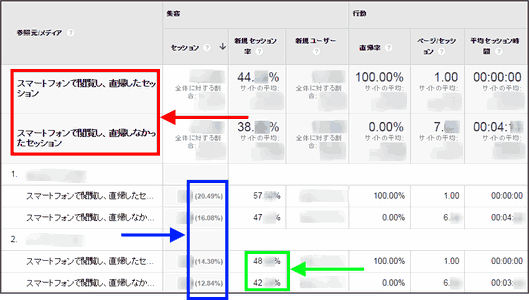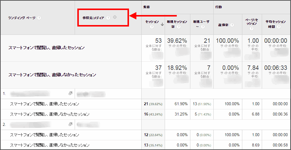 - 「スマートフォンで閲覧し、直帰しなかったセッション」「スマートフォンで閲覧し、直帰したセッション」セグメント(図5赤枠部分)を「適用」する