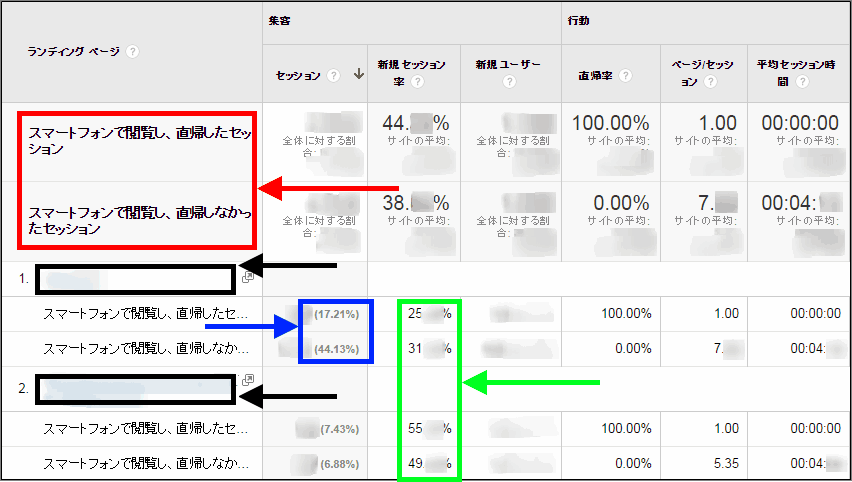 このような場合は、少し下位のランディング ページを見れば、容易に直帰した割合の方が高いページをピックアップできると思うので、そのランディング ページの新規セッション率(図8緑枠部分)の違いなども見ていこう。
