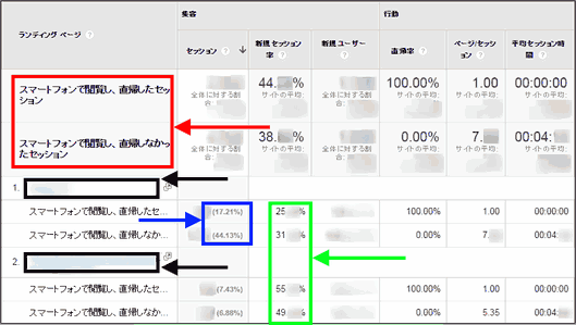 おもに直帰したセッションの問題点をあぶりだしたいので、直帰の多い順に並んでいる方が見やすい。そのためセグメントを掛ける順番は「スマートフォンで閲覧し、直帰したセッション」が先で、「スマートフォンで閲覧し、直帰しなかったセッション」を後にする(図7赤枠部分)のが望ましい。図6は逆になっている(図6赤枠部分)が、こちらは2つの折れ線が同じレベルで見較べられるので問題ない。