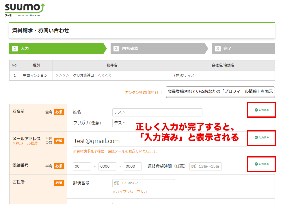 入力OKマークを取り入れている例として、リクルートグループ様のスーモ「資料請求・お問い合わせフォーム」※を見てみましょう。