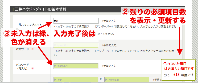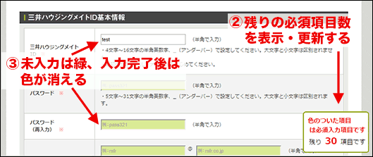 2つ目の工夫は、「残り必須項目数のリアルタイム表示」です。この例として紹介するのは、三井不動産グループ様 三井ハウジングメイト会員登録フォームです。
