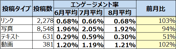 「テキスト投稿」のみ、7月に突出して高い数値を出し、8月は6月と同等の数値に戻っています。他のタイプに大きな変動はなく、写真投稿、動画投稿の順で高い数値を示しました。