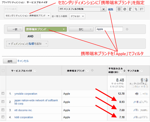 実際、セカンダリ ディメンションに携帯端末モデルを指定して、そこで「Apple」で絞り込んでみると、また別の結果が出てきます。