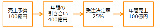 たとえば、売上予算が年間100億円の事業部があるとします。この事業部の引き合い(SQL)からの1年以内の受注決定率が25%で、営業や代理店が1年間に創出する引き合いの合計が400億円以上だった場合、この事業部にはマーケティングの支援は必要ありません。