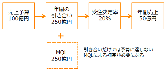 こうなると、期首に見えている売上は250億円の20%の50億円ですから、売上予算100億円の半分にしかなりません。このまま放置すれば確実に50億円の穴が空くのです。これを解決する方法は、今までのSQLとは別に、不足している250億円の案件を他から持ってくるしかありません。つまりMQLの出番なのです。