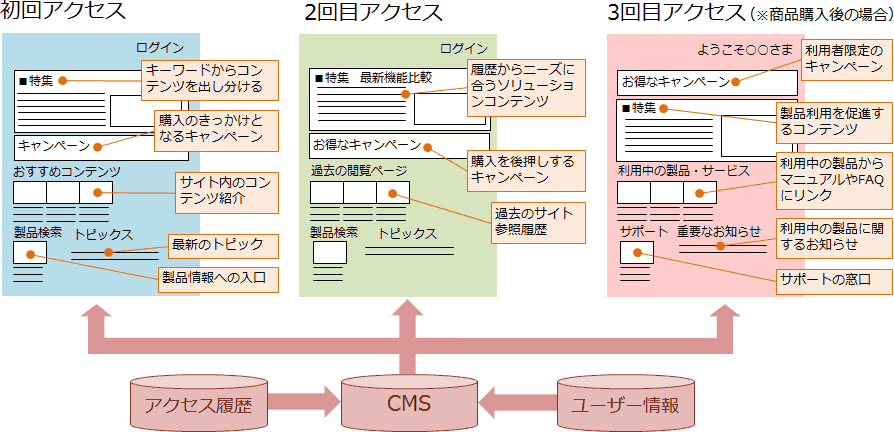 しかしWebサイトなら、初めての人なのか、何度も来ている人なのか、そんなことは簡単に確認できる。だからこそ、お客さまごとにコンテンツを最適化しなければならない。