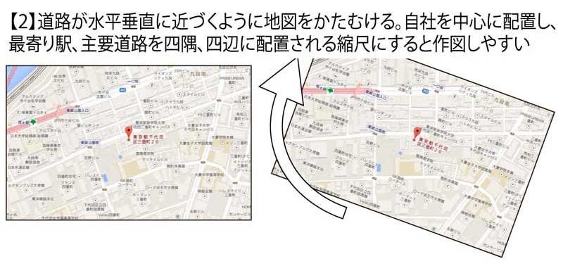 一般的に地図を描くとき、方角は北を上にして描きます。しかし、わかりやすさを優先するならこの限りではありません。インプレスなら時計回りに20度ほど回転させると、通りの大半が水平と垂直になります(図2、図3)。