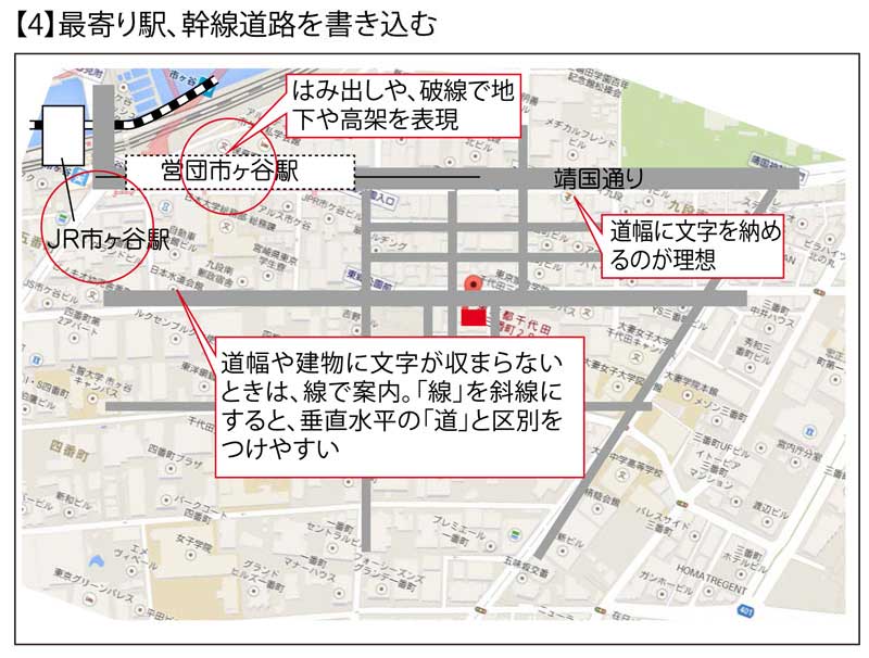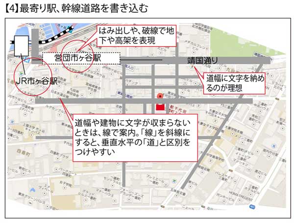 「自転車」や「自動車」なら「主要道路」が駅と同様の役割を果たし、インプレスの場合は「靖国通り」です。さらにインプレスの立地では、営団地下鉄の「市ヶ谷駅」に隣接してJRの「市ヶ谷駅」もあります。こちらは地下鉄と異なり「地上」に駅があることから、「ランドマーク(目印)」としての機能も期待できるので、両方記載するのがよいでしょう。