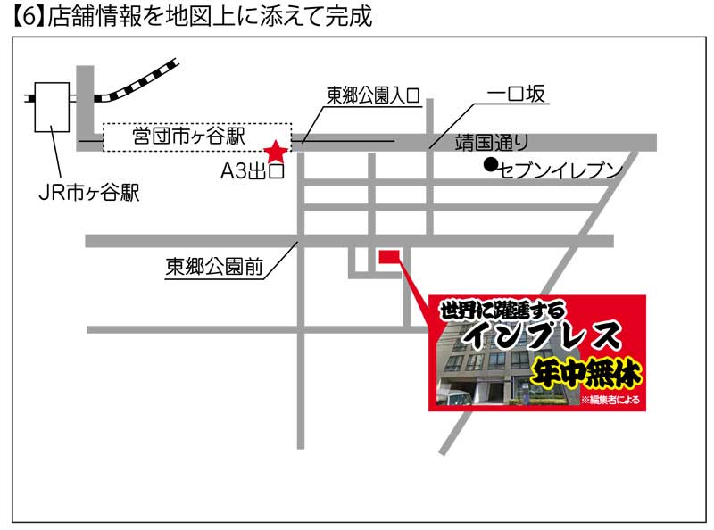 それでは実際の地図作成に移ります。ここでは、本サイトの運営会社「インプレス」を路面店とした案内地図を作ると仮定し、7つの「実戦技」を紹介します。