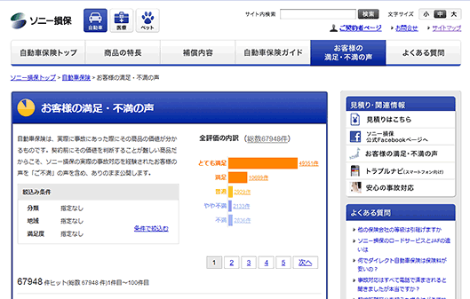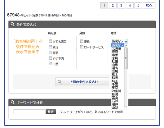 この貴重な6万8000件のお客様の声は、そのままずらっと並べられているだけでなく、北海道から沖縄までの地域別や、テーマ、満足度別に絞り込んだり、キーワードで検索できたりと、まさにソニー損保と自動車保険を契約して「こんな経験をした」ことがすべてわかります。