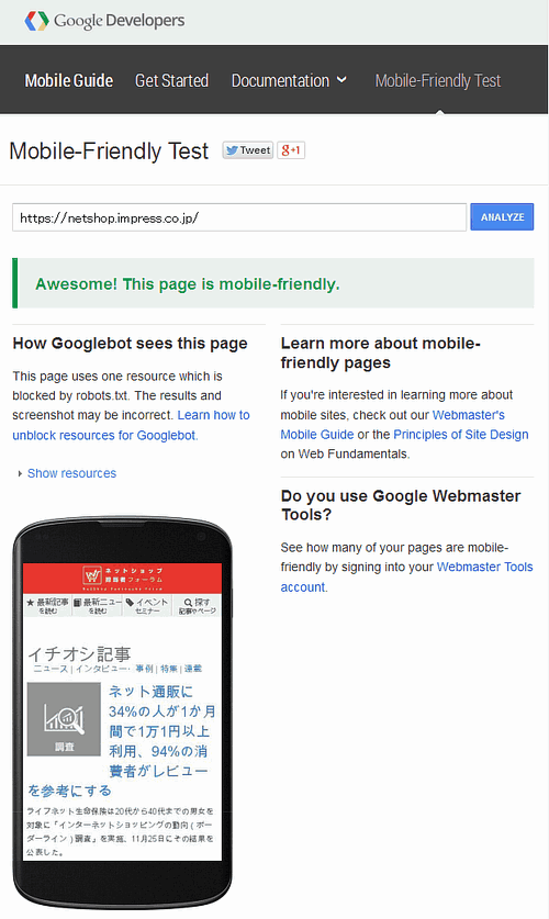 こちらは、URLを指定すると、そのページがモバイルに適切に対応しているかどうかを、その場でチェックできる(残念ながら、現時点ではインターフェイスは英語だけのようだ)。