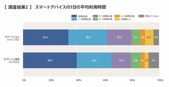 1日における平均利用時間を調べたところ、スマートフォンユーザーの62.6%、タブレットユーザーの52.9%と、どちらも半数を越えるユーザーが1日に1時間以上の長時間利用をしている結果だった。