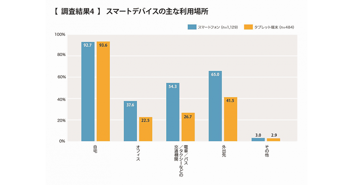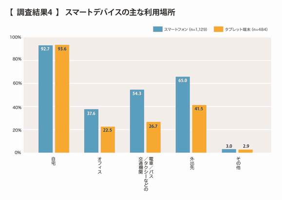 利用場所に関する調査では、スマートフォン、タブレット共に、90%以上が「自宅」で利用する結果だった。