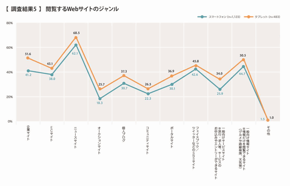 スマートデバイスでどのようなWebサイトを閲覧しているか。スマートフォン、タブレットユーザー共に最も閲覧しているのは「ニュースサイト」で、60%を越える。
