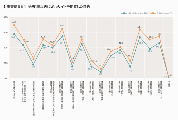 どんな目的でWebサイトを閲覧したかについては、スマートフォン、タブレットユーザー共に最も多かったのが「商品を購入する目的」で、スマートフォンユーザーで58.7%、タブレットユーザーでは69.9%だった。