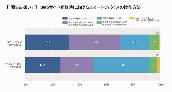 - スマートフォンは片手、縦向きで操作。タブレットは片手/両手、縦向き/横向きがほぼ同数に。