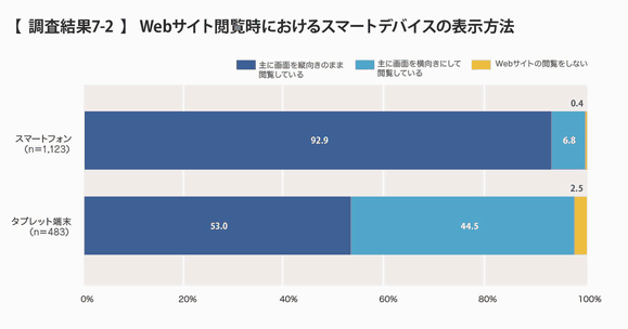 Webサイト閲覧時の画面の向きに関しては、スマートフォンユーザーの92.9%が「主に画面を縦向きのまま閲覧している」だった。