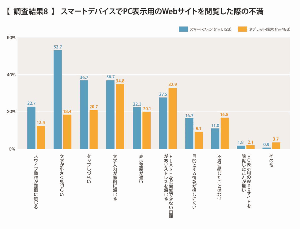 - ⑧スマートデバイスでPC表示用のWebサイトを閲覧した際の不満