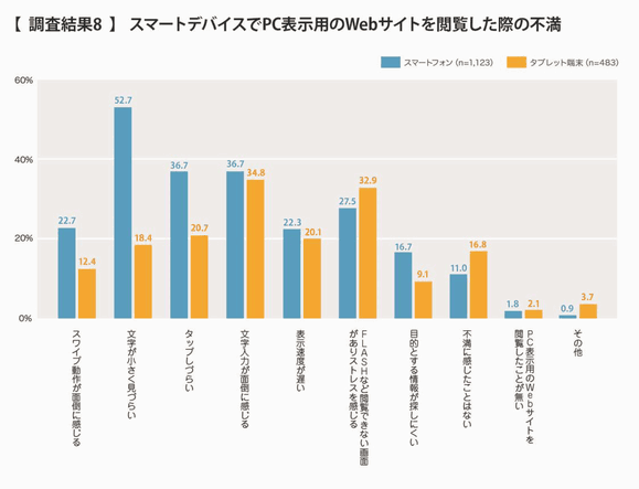 PC表示用のWebサイトを閲覧して感じる不満に関する調査結果をみると、スマートフォンユーザーにおける上位は、次のとおりだった。