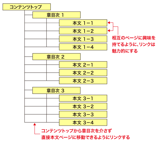 ページ構成は「コンテンツトップ」「章目次」「本文ページ」3段構え