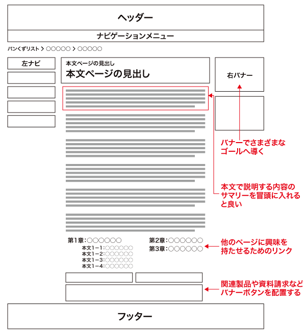 今まで解説してきたことをページの構成(ワイヤーフレーム)にすると、下図のようになります。