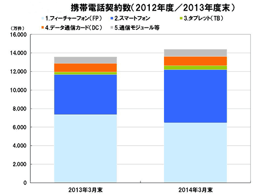 2014年4月にMM総研から発表された「スマートフォン市場規模の推移・予測(2014年4月)」によると2014年3月末時点のフィーチャーフォン契約数は6,468万件で(構成比44.9%)となっており依然として、全体の半数近い割合を占めています。