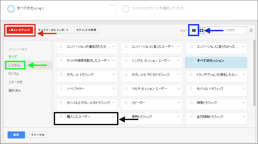 今回作成したセグメントと比較対象とするセグメントとして、標準に用意されている「購入したユーザー」を併用することにしよう。セグメント機能(図2)を表示させ、「システム」(図2緑枠部分)を選択した表示の下方にある、「購入したユーザー」(図2黒枠部分)を選択すればよい。