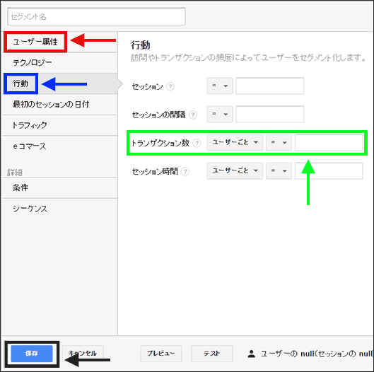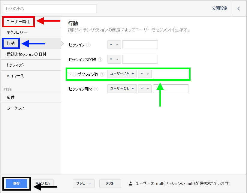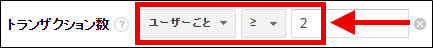 今回はユーザー ベースのセグメントに指定したいので、トランザクション数を「ユーザーごと」「≥(以上)」「2」(図4赤枠部分)と指定する。