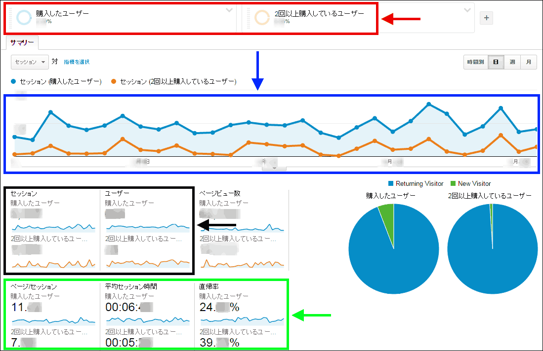 また「ページ/セッション」「平均セッション時間」「直帰率」の指標を比較してみると(図5緑枠部分)、2回以上購入しているユーザーの方がむしろ熱心にサイトを見ていないという驚きの結果になっている。どうやら頻繁に購入するユーザーは、高頻度でサイトに訪問するが、お目当てのものが決まっているのか、それが更新されていなかったりあるいはなかったりすると、その他のページをじっくり見ることもなく、さっさと閲覧をやめて効率的な買い物を心掛けているのではないかと解釈できる。