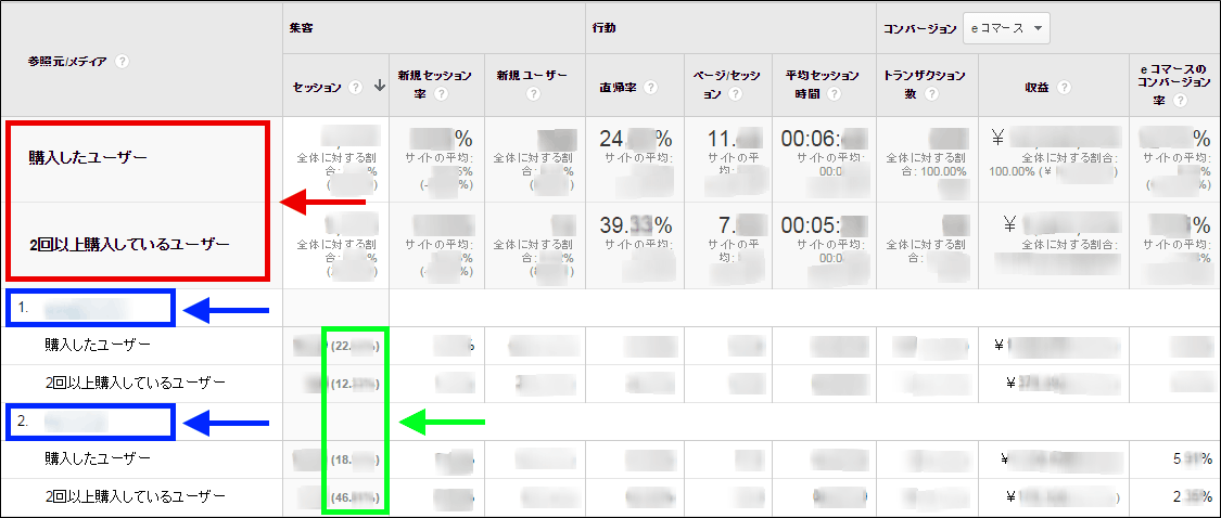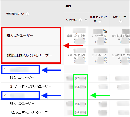 次に[集客]>[すべてのトラフィック]レポートに「購入したユーザー」セグメントと「2回以上購入しているユーザー」セグメントの2つを掛けた(図6赤枠部分)レポートを見よう。